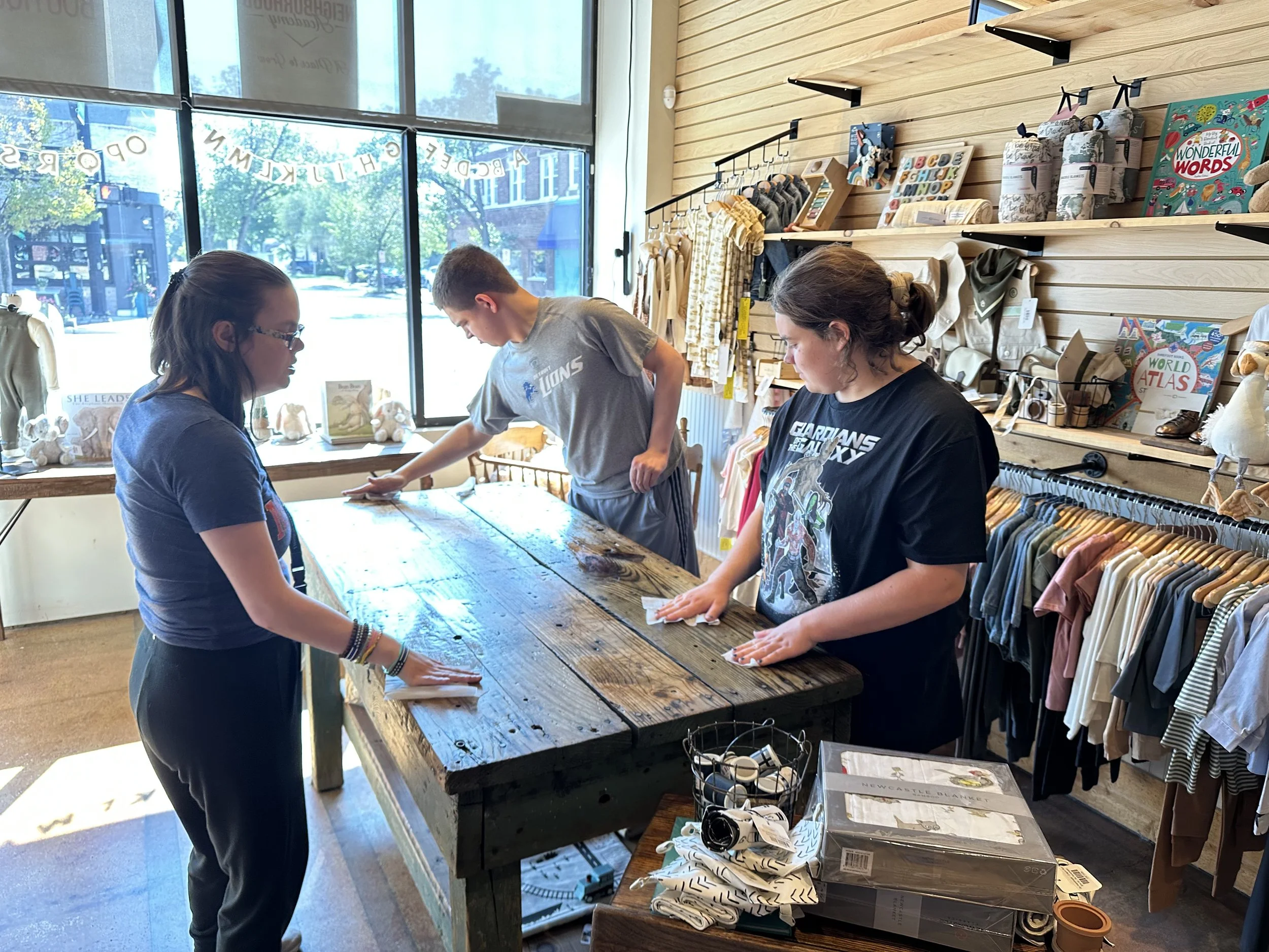 Two women and one man cleaning a wooden table inside a clothing and gift store during daytime.