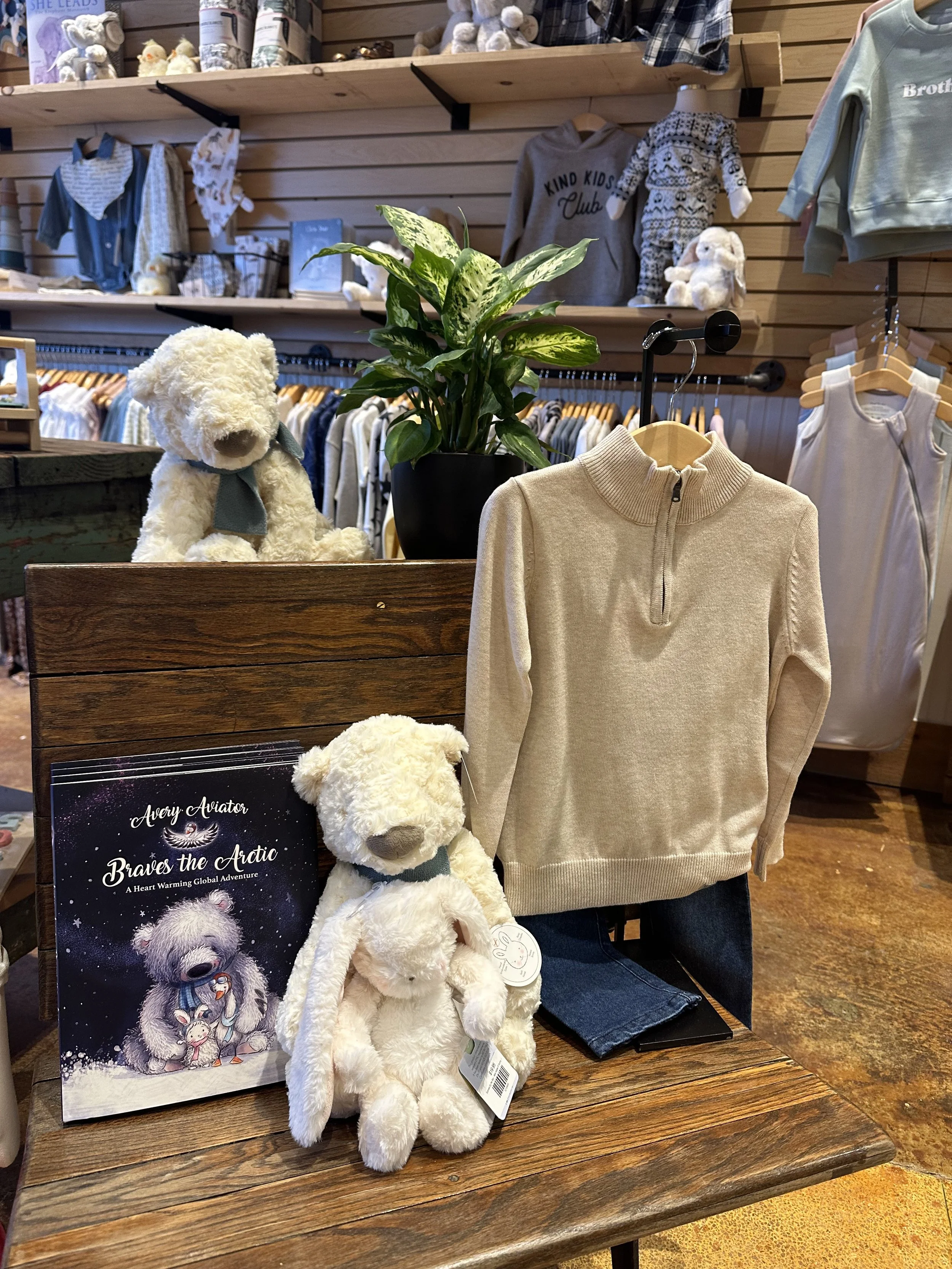 Display of plush teddy bears, a children's book titled 'Avery Aviator Braves the Arctic', a beige sweater on a hanger, and a sprig of green leaves in a black pot in a children's clothing store.